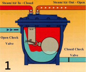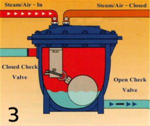 [3] เมื่อคอนเดนเสทถูกปั๊มไปแล้ว ทำให้ลูกลอยตกลงมาทำให้การทำงานของวาล์ว steam/air สลับหน้าวาล์วกันอีกครั้งนึง ทำให้ไอน้ำหรืออากาศไหลออกไปทาง steam/air outlet ที่เปิดอยู่ (ส่วน steam/air inlet กลับมาเป็นสถานะปิดอีกครั้ง) ดังรูปที่ 2-3