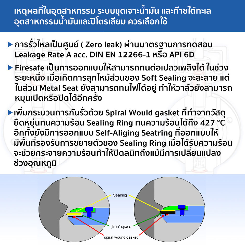 - การรั่วไหลเป็นศูนย์ ( Zero leak) ผ่านมาตรฐานการทดสอบ leakage rate A acc. DIN EN 12266-1 หรือ API 6D