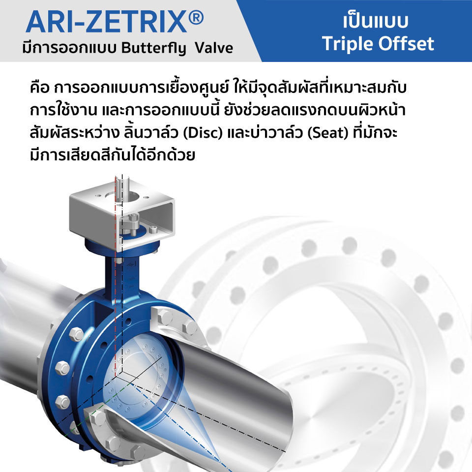 ARI-ZETRIX: Triple offset butterfly valve การออกแบบนี้จะช่วยลดแรงเสียดทาน และทำให้ปิดสนิทไม่ทำให้เกิดการรั่วไหล (zero leak) อีกทั้งยังใช้แรงบิดน้อย หรือ torque ต่ำในการเปิด-ปิด ทำให้ง่ายต่อการใช้งาน