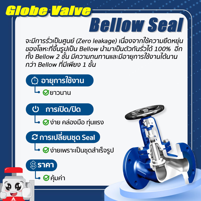 ซึ่งมีความแตกต่างเพียงจุดเดียวคือ การกันรั่วที่ก้านวาล์ว (stem) ด้วยการออกแบบให้มี seal ที่เป็นโลหะ bellow เชื่อมต่อกับก้านวาล์ว แทนที่ในส่วนที่เป็น stuffing box ซึ่งโดยส่วนใหญ่เป็น packing seal รัดประกบอยู่ที่ก้านวาล์ว สามารถพิจารณาเลือกการใช้งานได้ตามคุณสมบัติดังนี้
