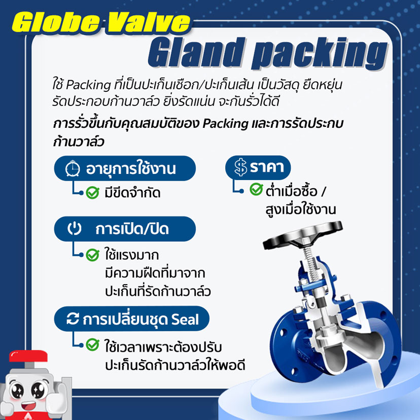 | 1. การกันรั่วขึ้นก้านวาล์ว | ใช้ความยืดหยุ่นโลหะที่ขึ้นรูปเป็น bellow เป็นตัวกันรั่ว และการเชื่อมต่อก้านวาล์วเป็นชิ้นเดียวกัน จนกระทั่งหนีบปิดที่หน้าจาน bonnet = การรั่วเป็นศูนย์ (Zero Leakage) | ใช้ packing ที่เป็นปะเก็นเชือก/ปะเก็นเส้น เป็นวัสดุ ยึดหยุ่นรัดประกอบก้านวาล์ว ยิ่งรัดแน่น จะกันรั่วได้ดี = การรั่วขึ้นกับคุณสมบัติของ packing และการรัด ประกบก้านวาล์ว | |