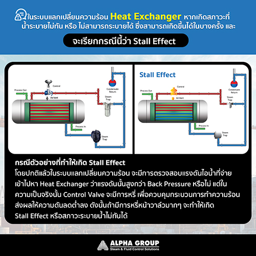 Stall Effect คือสภาวะที่น้ำภายในระบบแลกเปลี่ยนความร้อนไม่สามารถระบายออกได้ทัน ส่งผลให้ระบบทำงานผิดปกติ ซึ่งมักเกิดขึ้นในกรณีที่มีการหรี่หน้าวาล์ว (Control Valve) มากเกินไป ส่งผลให้แรงดันไอน้ำที่จ่ายเข้าสู่ Heat Exchanger ต่ำกว่าแรงดันย้อนกลับ (Back Pressure) จนทำให้การระบายของเหลวภายในไม่สามารถเกิดขึ้นได้อย่างปกติ