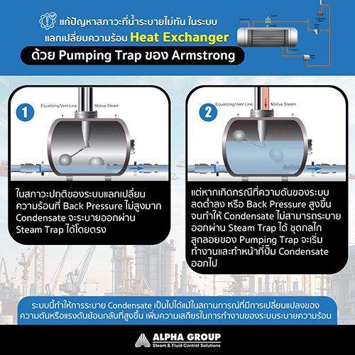 อัลฟ่ากรุ๊ป ขอแนะนำแนวทางแก้ปัญหาสภาวะน้ำระบายไม่ทันในระบบ Heat Exchanger ด้วย Pumping Trap จาก Armstrong