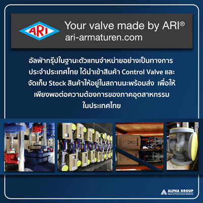 อัลฟ่ากรุ๊ป ได้รับการแต่งตั้งอย่างเป็นทางการ ในการเป็นผู้นำเข้าและจัดจำหน่ายสินค้าของ ARI Armaturen ผู้ผลิตวาล์วอุตสาหกรรมที่มีประสิทธิภาพ และเป็นที่การันตีไปทั่วโลก เพียงเจ้าเดียวในประเทศไทย และเราพร้อมที่จะทุ่มเทในการส่งมอบวาล์วคุณภาพดีอย่าง ARI ให้กับลูกค้าทุกท่าน
