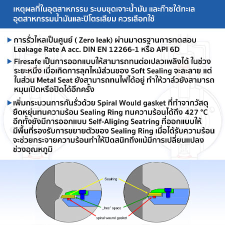 • การรั่วไหลเป็นศูนย์ ( Zero leak) ผ่านมาตรฐานการทดสอบ leakage rate A acc. DIN EN 12266-1 หรือ API 6D