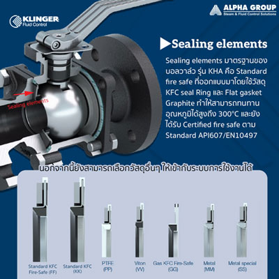 Sealing elements มาตรฐานของบอลวาล์ว รุ่น KHA คือ Standard fire safe ที่ออกแบบมาโดยใช้วัสดุ KFC seal Ring และ Flat gasket Graphite ทำให้สามารถทนทานอุณหภูมิได้สูงถึง 300°C และยังได้รับ Certified fire safe ตาม Standard API607/EN10497