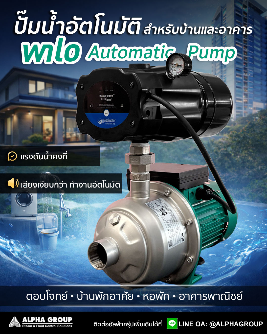 บริการประกอบ ชุดปั๊มน้ำอัตโนมัติ WILO Automatic Pump แบบพร้อมประกอบเสร็จ โดยประกอบร่วมกับ PumpWave™ Plus โดยผ่านการออกแบบและตรวจสอบคุณภาพโดยทีมวิศวกร พร้อมใช้งานได้ทันที ลดขั้นตอนหน้างาน และลดความเสี่ยงจากการติดตั้งผิดพลาด ลูกค้าสามารถติดตั้งและใช้งานได้ทันที โดยไม่ต้องประกอบระบบเพิ่มเติมหน้างาน