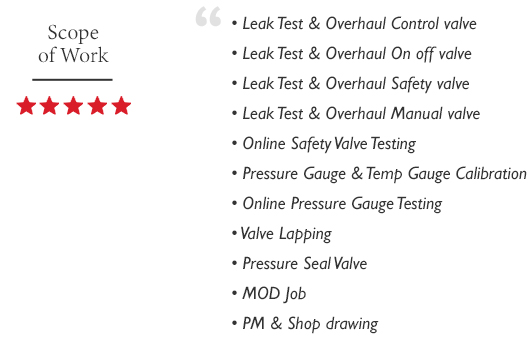 การทดสอบทุกขั้นตอนดำเนินการโดย ทีมวิศวกรและช่างเทคนิคผู้เชี่ยวชาญเฉพาะด้าน พร้อมด้วยเครื่องมือและอุปกรณ์ที่ทันสมัย ซึ่งได้รับการออกแบบมาเพื่อรองรับงานซ่อมและทดสอบวาล์วโดยเฉพาะ นอกจากนี้ เรายังจัดทำ Service Report อย่างละเอียดภายหลังการทดสอบ เพื่อใช้ประกอบการประเมินและวางแผนบำรุงรักษาระบบในระยะยาว โดยคำนึงถึงความปลอดภัย ประสิทธิภาพ และอายุการใช้งานของอุปกรณ์เป็นสำคัญ