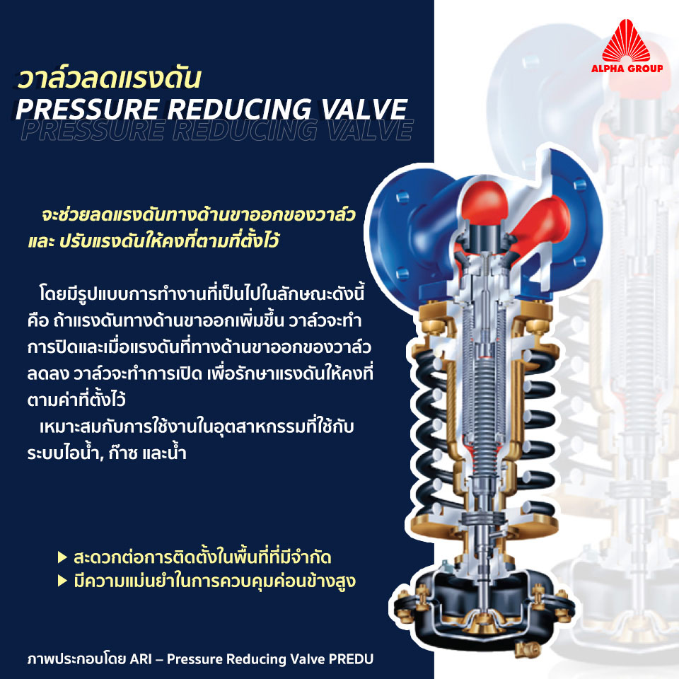 จะช่วยลดแรงดันทางด้านขาออกของวาล์วและ ปรับแรงดันให้คงที่ตามที่ตั้งไว้โดยมีรูปแบบการทำงานที่เป็นไปในลักษณะดังนี้คือ ถ้าแรงดันทางด้านขาออกเพิ่มขึ้น วาล์วจะทำการปิดและเมื่อแรงดันที่ทางด้านขาออกของวาล์วลดลง วาล์วจะทำการเปิด เพื่อรักษาแรงดันให้คงที่ตามค่าที่ตั้งไว้ เหมาะสมกับการใช้งานในอุตสาหกรรมที่ใช้กับ ระบบไอน้ำ, ก๊าซ และน้ำ