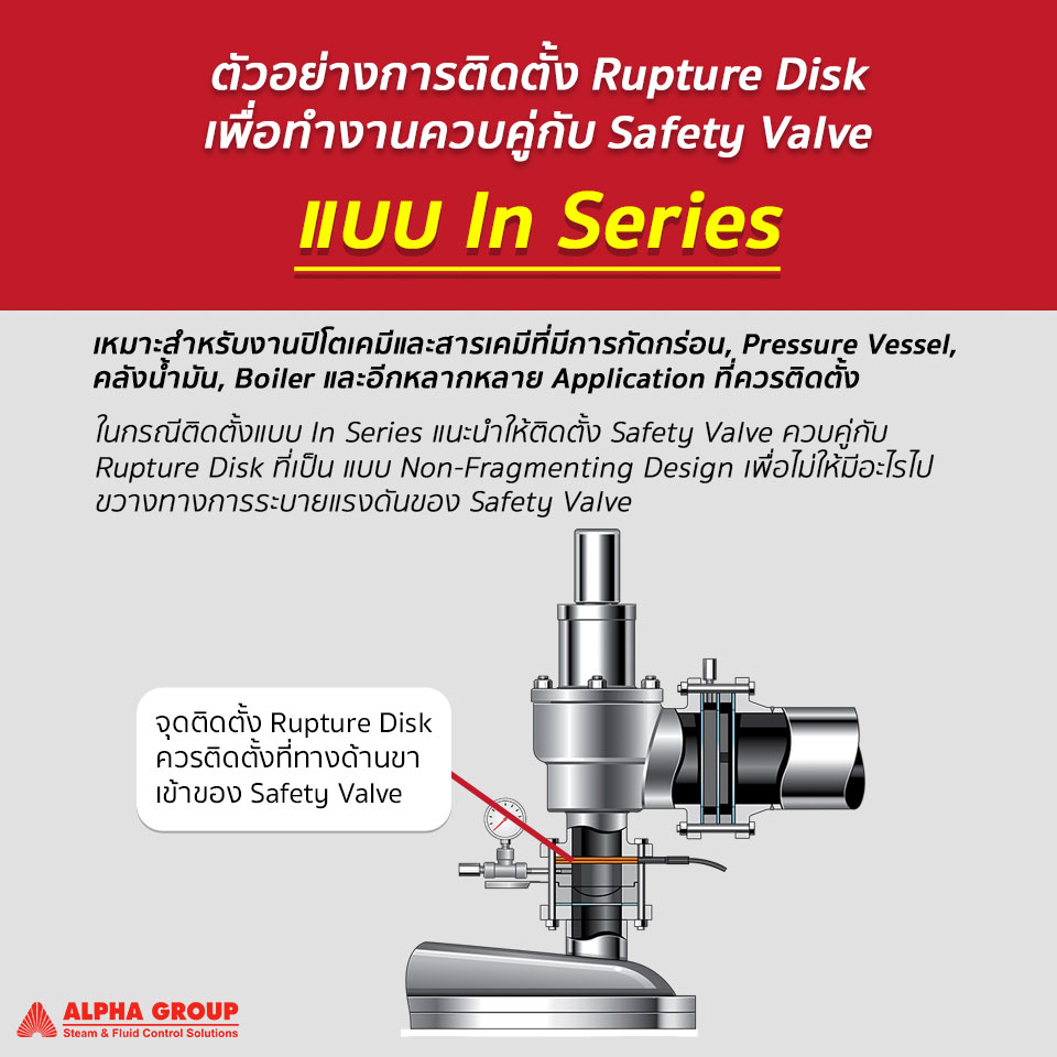 - โดยทั่วไปแล้ว Safety Valve ที่ใช้กับสารกัดกร่อนสูง จะทำให้ Safety Valve เกิดความเสียหายในที่สุด เมื่อใช้ Rupture Disk ร่วมกับ Safety Valve ตัว Rupture Disk จะช่วยป้องกันการกัดกร่อน และช่วยยืดอายุการใช้งานของ Safety Valve
