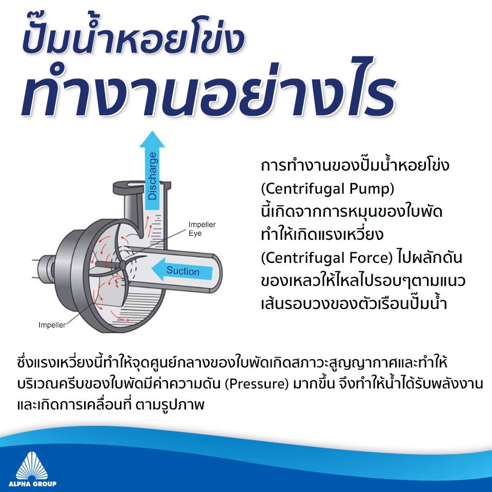 ปั๊มน้ำหอยโข่ง (Centrifugal Pump) หรือปั๊มน้ำแรงเหวี่ยงหนีศูนย์กลาง เป็นเครื่องจักรที่ถูกคิดค้นมานานนับศตวรรษ อีกทั้งยังถือเป็นหัวใจหลักในการเคลื่อนย้ายน้ำตามแหล่งน้ำต่างๆ ทั้งในชีวิตประจำวัน ตามตึกอาคาร และโรงงาน โดยการทำงานของปั๊มน้ำหอยโข่งนี้เกิดจากการหมุนของใบพัดทำให้เกิดแรงเหวี่ยง (Centrifugal Force) ไปผลักดันของเหลวให้ไหลไปรอบๆตามแนวเส้นรอบวงของตัวเรือนปั๊มน้ำ ซึ่งแรงเหวี่ยงนี้ทำให้จุดศูนย์กลางของใบพัดเกิดสภาวะสูญญากาศและทำให้บริเวณครีบของใบพัดมีค่าความดัน (Pressure) มากขึ้น จึงทำให้น้ำได้รับพลังงานและเกิดการเคลื่อนที่ ตามรูปภาพด้านบนครับ และนี่เป็นเพียงหลักการคร่าวๆเท่านั้นของปั๊มหอยโข่ง หรือ Centrifugal Pump